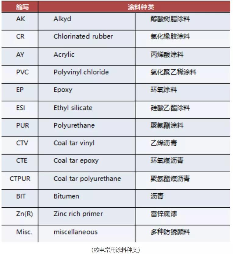 以大亚湾核电站为例,室内金属构件主要采用膦酸锌环氧聚酰胺底漆/聚酰胺环氧苯酚面漆或环氧云母氧化铁涂料/高固体分环氧涂料;室外金属构件主要采用含硅或环氧富锌底漆/聚酰胺环氧乙烯中间漆/脂肪族聚酯聚氨酯面漆或环氧富锌涂料,以及环氧云母氧化铁涂料。