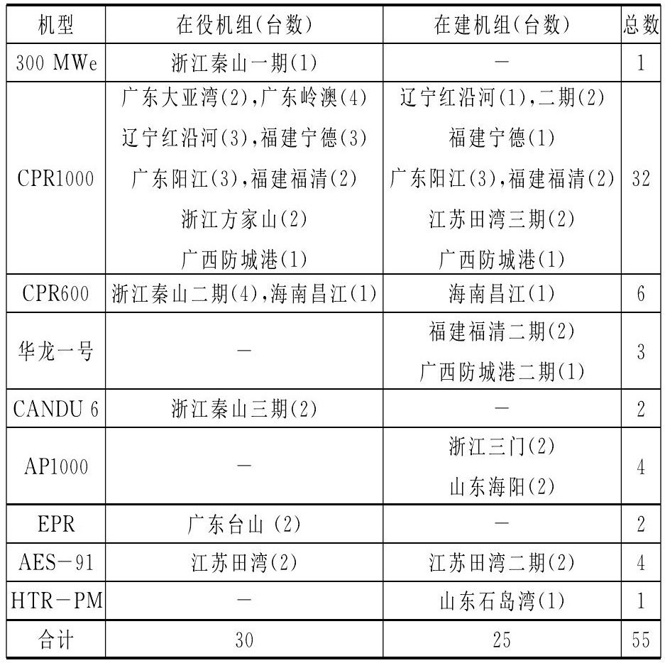 中国大陆核电从20世纪80年代起步。截至2016年4月,在役、在建核电机组总数达到55台,分布在浙江、广东、江苏、辽宁、山东、福建、广西、海南等沿海8个省区,总装机容量5 600多万千瓦。其中在役机组30台,装机容量2 800多万千瓦;在建25台,装机容量2 700多万千瓦,核电机组的概况见表1。目前,中国大陆在役核电机组已经超过韩国、俄罗斯,仅次于美国、法国、日本,列全球第四。